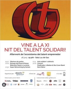 Un any més torna la festa solidària més divertida i emprenedora de l’any. Organitzada per la Fundació Impulsa Talentum a favor de la investigació del càncer infantil. El proper dijous 26 de juny, a les 19.30h, a la Sala Luz de Gas t’esperem per gaudir junts de l’ecosistema més emprenedor i festiu de Barcelona. En aquesta ocasió gaudirem de la presència de Lucrecia, a la que lliurarem el Premi Welcome Talent, i després podràs assaborir un exquisit còctel organitzat per Semon, gaudir de bona música i participar en una subhasta d’art solidària, tot a favor de la investigació del càncer infantil a través de Good Max i «Asociación Benéfica Anita». No t’ho perdis! Compra la teva entrada com més aviat millor, que l’aforament és limitat, i gaudeix del millor afterwork de Barcelona, amb bon menjar, bona música i molt d’art i solidaritat. Programa: 19:30 Obertura de portes 20:00 Lliurament del Premi d’Honor Welcome Talent a Lucrecia 20:30 Networking i Còctel by Semon 21:15 Acte solidari i subhasta d’art 22:00 Concerts Predicador JJ.Bolton & Ska Cover Band Rock Noise Entrades: Entrada a la «11a Nit del Talent Solidari»: 35€. Inclou assistència a l’esdeveniment, sopar-còctel i concerts. Entrada «Fila Zero»: Donació de 25€/50€/100€/250€. Si no pots venir a l’esdeveniment però vols col·laborar amb la investigació del càncer infanril, pots fer-ho donant a través de “Fila 0”. Comptem amb tu!! Tota la recaptació d´aquest esdeveniment anirà destinada a impulsar la investigació de la Biòpsia Líquida desenvolupada pel Laboratori Oncologia Molecular del SJD Pediatric Cancer Center Barcelona.
